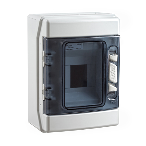 12901 Serie Ecology. Caja de distribución para sobreponer con ventana transparente PC color fumé. Módulos: 1x4 raíl DIN. Dimensiones: 231Hx166Wx113Dmm. Grado de protección: IP65. Protección impacto: IK08. Tensión de empleo: 100VAC/1500VDC. Doble aislamiento Clase II. Temperatura de trabajo: -25ºC~+40ºC. Material de base y marco: ABS Gris RAL 7035. Plásticos libres de halógenos con protección UV.
