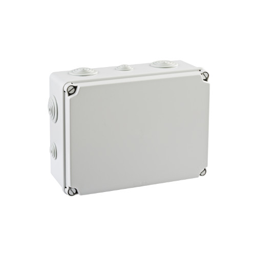 19200 Serie Light. Caja estanca de derivación con conos pasacables. Para sobreponer. Dimensiones: 194Hx255Wx101Dmm. Entradas de conos: 4xM25-6M40. Tapa opaca. Resistencia al impacto IK07. Tensión de uso: 1000VCA/1500VCD. Doble asilamiento Clase II. Temperatura de operación: -25ºC~+40ºC. Grado de protección IP67.