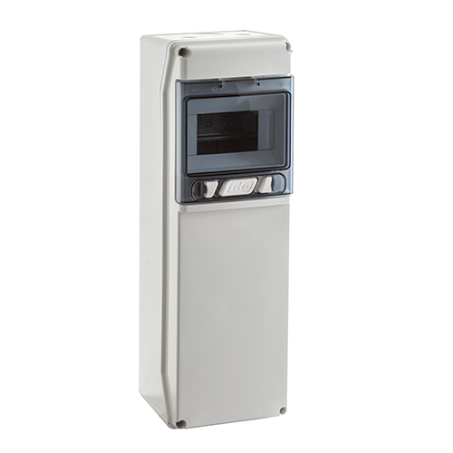 24349 Serie Star. Caja toma de corriente para sobreponer con ventana transparente PC color fumé. Módulos: 1x6 raíl DIN. Dimensiones: 436Hx142Wx137mm. Grado de protección: IP65. Protección impacto: IK08. Tensión de empleo: 100VAC/1500VDC. Doble aislamiento Clase II. Temperatura de trabajo: -25ºC~+40ºC. Material de base y marco: ABS Color gris RAL 7035. Plásticos libres de halógenos con protección UV.