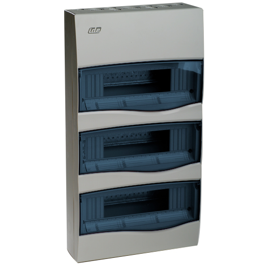 25800 Serie . Caja de distribución para sobreponer con ventana transparente PC color fumé. Módulos: 3x12 (36) raíl DIN. Dimensiones: 497Hx264Wx99Dmm. Grado de protección: IP40. Protección impacto: IK08. Tensión de empleo: 100VAC/1500VDC. Doble aislamiento Clase II. Temperatura de trabajo: -25ºC~+40ºC. Material de base y marco: ABS Blanco RAL 9003. Plásticos libres de halógenos con protección UV.