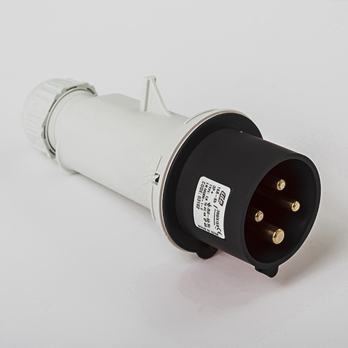 Clavija aérea. Corriente nominal: 16A a una tensión de trabajo de 500VCA. Configuración de contactos: 3P+T. Código horario: 7h, color negro. Resistencia impacto: IK08. Material: poliamida 6 HF, cumple la directiva RoHS. Material contacto: latón. Grado de proteccón: IP44.