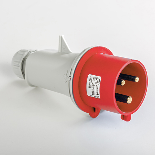 Clavija aérea. Corriente nominal: 32A a una tensión de trabajo de 400VCA. Configuración de contactos: 2P+T. Código horario: 9h, color rojo. Resistencia impacto: IK08. Material: poliamida 6 HF, cumple la directiva RoHS. Material contacto: latón. Grado de proteccón: IP44.
