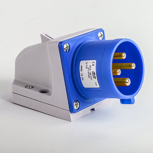 Clavija mural. Corriente nominal: 32A a una tensión de trabajo de 230VCA. Configuración de contactos: 3P+T. Código horario: 9h, color azul. Resistencia impacto: IK08. Material: poliamida 6 HF, cumple la directiva RoHS. Material contacto: latón. Grado de proteccón: IP44.