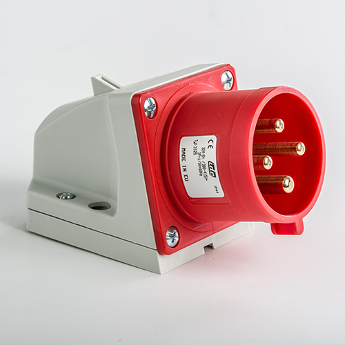 Clavija mural. Corriente nominal: 32A a una tensión de trabajo de 400VCA. Configuración de contactos: 3P+T. Código horario: 6h, color rojo. Resistencia impacto: IK08. Material: poliamida 6 HF, cumple la directiva RoHS. Material contacto: latón. Grado de proteccón: IP44.