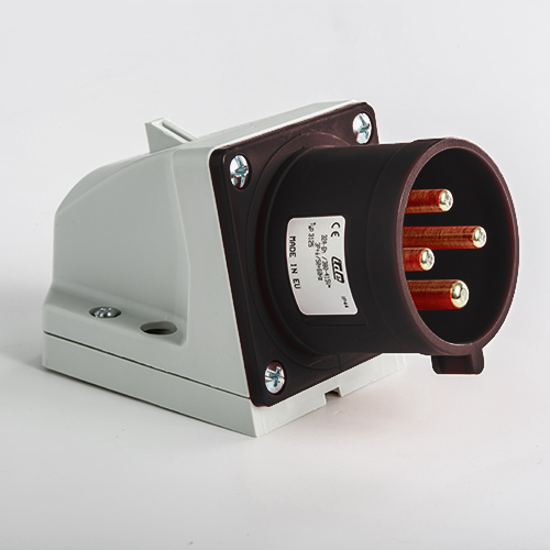 Clavija mural. Corriente nominal: 32A a una tensión de trabajo de 500VCA. Configuración de contactos: 3P+T. Código horario: 7h, color negro. Resistencia impacto: IK08. Material: poliamida 6 HF, cumple la directiva RoHS. Material contacto: latón. Grado de proteccón: IP44.