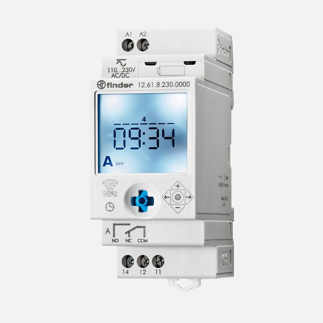 12.62.8.230.0000 Interruptor horario digital semanal. Tensión de alimentación de 110-230VCA. Equipado con dos contactos conmutados (2NANC), indicado para una corriente nominal de 16A a una tensión de 250VCA. Material estándar de los contactos plata oxido de estaño (AgSnO2). Vida útil eléctrica bajo carga en AC1 de 100x10³ ciclos. Capacidad de memoria de 50 maniobras. 1min de configuración mínima del intervalo. Temperatura de trabajo de -20°C~50°C. Dimensiones: 88.8Hx35Wx60.8Dmm. Categoría de protección IP20.