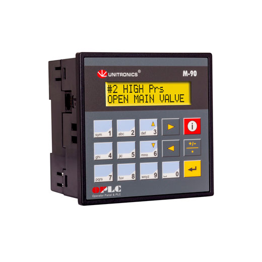 M91™ PLC inteligente con HMI textual y teclado, más una configuración de entradas y salidas integrado, se expande hasta 150 entradas y salidas.. LCD HMI textual de 2 lineasx 16 caracteres. Con 15 teclas. Cuenta con entradas: 12 entradas digitales PNP o NPN (posibilidad de configurar dos entradas de contador rápido HSC/Encoder de 10 kHz a 16 bits); salidas: 12 salidas digitales tipo transistor PNP (posibilidad de configurar 2 salidas como PWM/HSO a 0.5kHz). Tensión de alimentación: 12/24VCD. Características adicionales: Hasta 80 pantallas diseñadas por el usuario. Multilingüe: compatible con más de 15 idiomas y 20 símbolos gráficos. Desplazarse entre menús/recetas preprogramadas. Monitoreo de memoria y comunicaciones por medio de HMI, no se necesita una computadora. PID autosintonizado hasta 4 lazos. Control basado en fecha y hora. Utilidades de impresión. Carga de fuente completa.