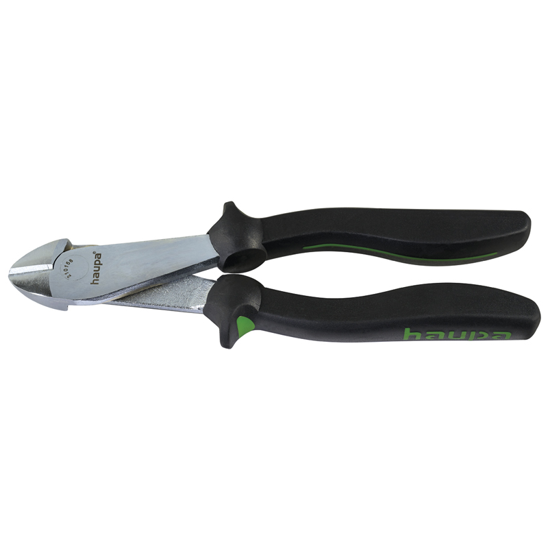 Pinzas de corte diagonal de 205mm de largo. Alicates de corte diagonal para trabajos pesados, de 2 componentes, de acero al carbono aleado DIN 5749, forjados y recocidos, filos de corte templados por inducción, con mango de plástico de 2 componentes con protección para las manos, cromados, para alambre blando y alambre duro.