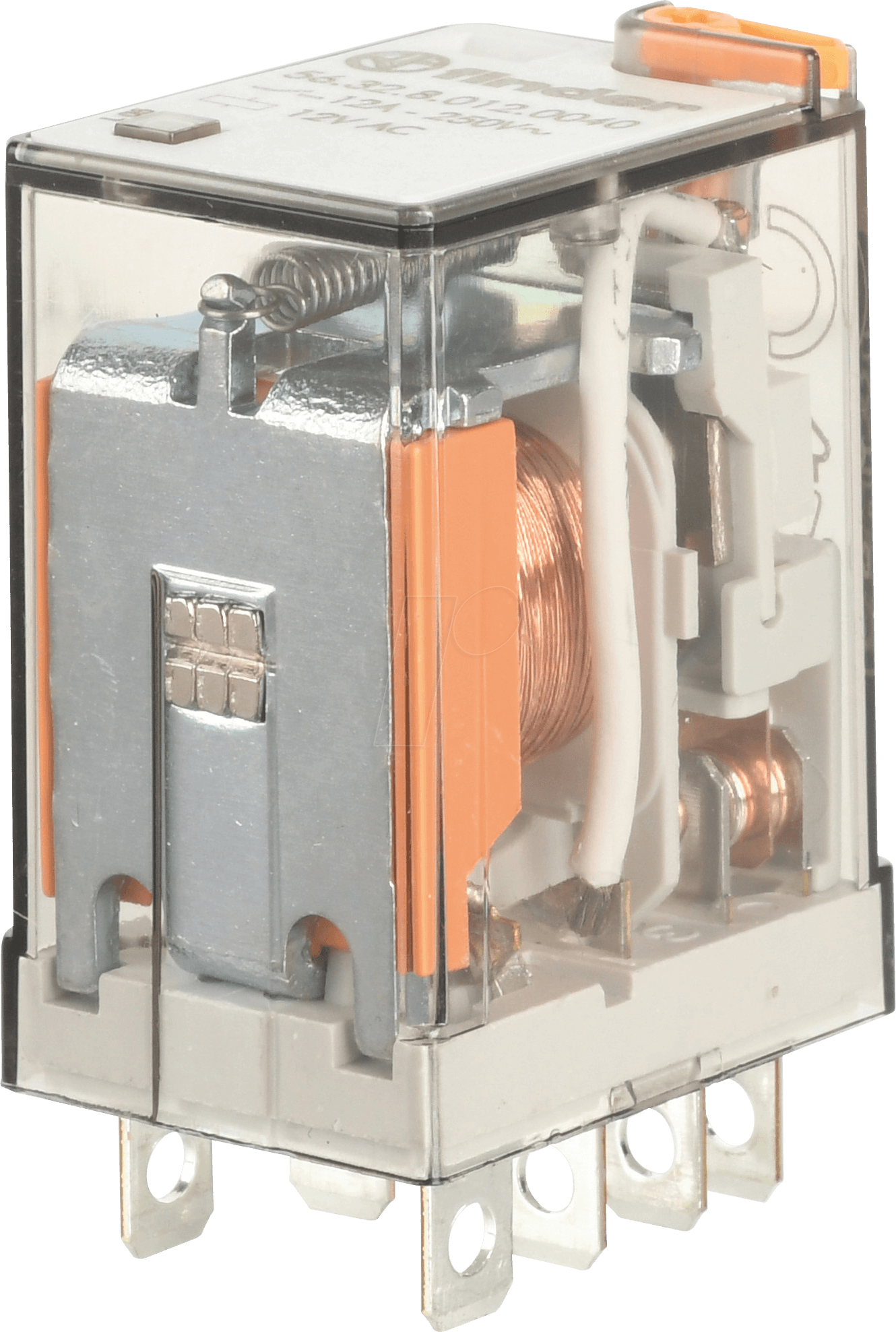 56.32.9.012.0040 Relevador / Relé de potencia. Tensión de circuito de mando 12VCD. Dos contactos conmutados 2CO (2NA2NC), material de los contactos AgNi (Plata Níquel), con capacidad de carga de 12A a 250VCA, 8 pines tipo fastón 187, para enchufar. Cuenta con: pulsador de prueba + indicador mecánico. Para montar en bases serie 96. Aprobaciones: CE, CCC, CSA, EAC, ENEC, Lloyd’s Register, RINA, UL, DVE
