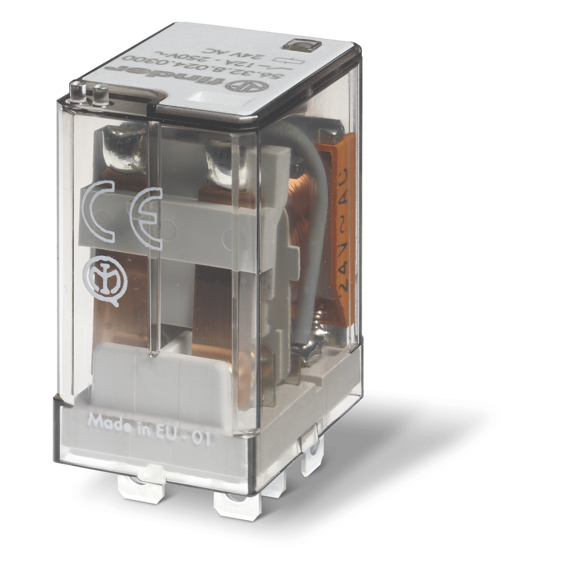 56.32.9.048.0040 Relevador / Relé de potencia. Tensión de circuito de mando 48VCD. Dos contactos conmutados 2CO (2NA2NC), material de los contactos AgNi (Plata Níquel), con capacidad de carga de 12A a 250VCA, 8 pines tipo fastón 187, para enchufar. Cuenta con: pulsador de prueba + indicador mecánico. Para montar en bases serie 96. Aprobaciones: CE, CCC, CSA, EAC, ENEC, Lloyd’s Register, RINA, UL, DVE