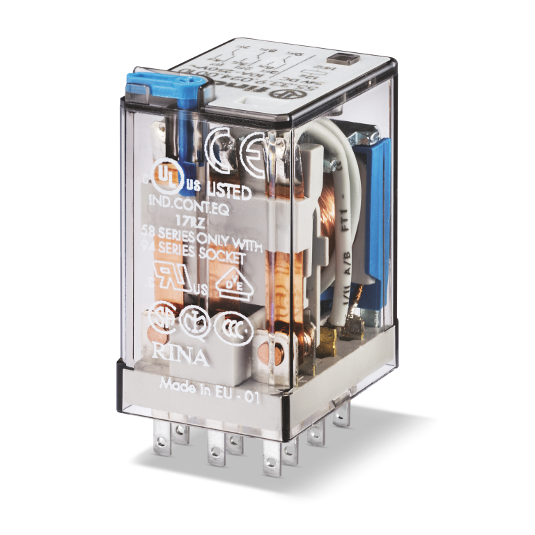 55.33.8.120.0010 Relevador / Relé industrial para aplicaciones generales. Tensión de circuito de mando 120VAC. Tres contactos conmutados 3CO (3NA3NC), material de los contactos AgNi (Plata Níquel), con capacidad de carga de 10A a 250VCA, 11 pines tipo fastón, para enchufar. Cuenta con: pulsador de prueba. Para montar en bases serie 94. Aprobaciones: CE, ANCE, CCC, CSA, EAC, ENEC, IMQ, Lloyd’s Register, RINA, UL, DVE