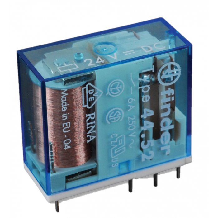 44.52.9.024.0000 Relevador / Relé circuito impreso. Tensión de circuito de mando 24VCD. Dos contactos conmutados 2CO (2NA2NC), material de los contactos AgNi (Plata Níquel), con capacidad de carga de 6A a 250VCA, 8 pines tipo aguja, reticulado 5mm. Aprobaciones: CCC, CSA, EAC, PCT, IMQ, RINA, UL, VDE