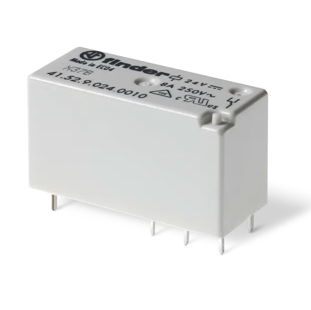 41.52.9.024.0010 Mini-Relevador / Relé para circuito impreso. Tensión de circuito de mando 24VCD. Dos contactos conmutados 2CO (2NA2NC), material de los contactos AgNi (Plata Níquel), con capacidad de carga de 8A a 250VCA, 8 pines tipo aguja, reticulado 5mm. Para montar en bases serie 93 y 95.13/15. Aprobaciones: EAC, ENEC, UL, RINA, DVE