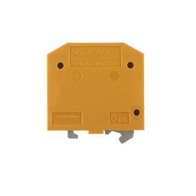 AKE 4 Serie SAK. Clema de tierra física, conexión brida-tornillo. Sección nominal de 4mm². Color verde-amarillo. Rango de conexión: 26-12AWG. Tensión nominal de acuerdo a IEC 60947-7-2: 500VCA. Dimensiones: 32Dx7Wx34.5Hmm. Montaje en riel DIN: TS 15. Temperatura de trabajo: -60 ~ +130.