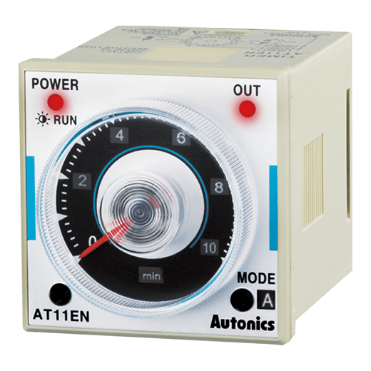 AT11EN Temporizador análogo undecal multifunción. Tamaño de pantalla DIN 48Wx48Hmm y 64.7Dmm. Operación de salida: On Delay, Flicker, Off Delay, On/Off Delay, Interval. Tensión de alimentación: 100-240VCA/24-240VCD. Rango de ajuste en tiempo: 0.05s-100hrs. Entrada de señal: NPN (Inhibir, iniciar, reiniciar). Salida e control: 1NA1NC (limitador de tiempo) + 1NA1NC (instantáneo).