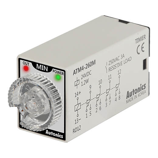 ATM4-260M Mini-temporizador análogo. Tamaño de pantalla DIN 21.5Wx28Hmm y 59.3Dmm. Operación de salida: On Delay. Tensión de alimentación: 24VCD. Rango de ajuste en tiempo: 6-60m. Entrada de señal: --. Salida e control: 4 contactos conmutados 4NA4NC.