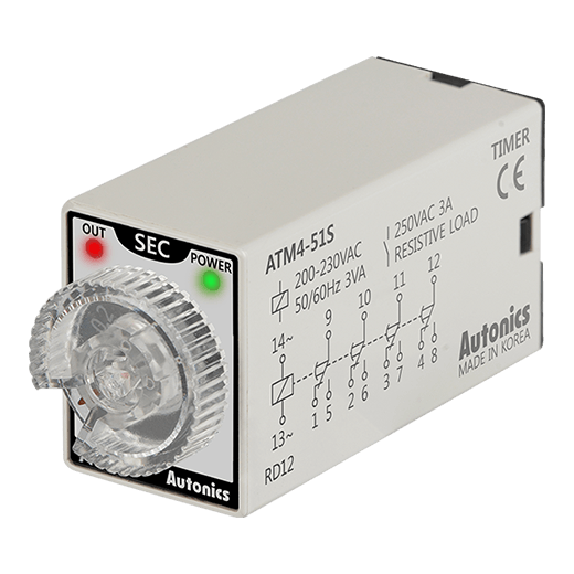 ATM4-51S Mini-temporizador análogo. Tamaño de pantalla DIN 21.5Wx28Hmm y 59.3Dmm. Operación de salida: On Delay. Tensión de alimentación: 220VCA. Rango de ajuste en tiempo: 0.1-1s. Entrada de señal: --. Salida e control: 4 contactos conmutados 4NA4NC.