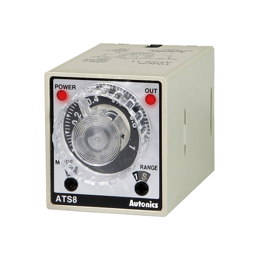 ATS8-41 Temporizador análogo octal multifunción. Tamaño de pantalla DIN 38Wx42Hmm y 70Dmm. Operación de salida: ON Delay, Flicker e Intervalo. Tensión de alimentación: 100-240VCA/24-240VCD. Rango de ajuste en tiempo: 0.1-1. Salida e control: 1NA1NC (limitador de tiempo) + 1NA1NC (instantáneo).
