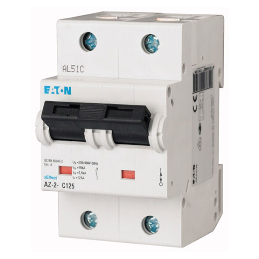 AZ-2-C80 xEfect Interruptor automático termomagnético (disyuntor MCB). 2 polo(s). Corriente nominal: 80A. Curva de disparo: tipo C. Capacidad interruptiva de acuerdo a IEC 60947-2: 20kA. Tensión nominal (IEC): 230/400VCA y 60VCD por polo. Montaje en riel DIN IEC/EN60715. Grado de protección: IP20.
