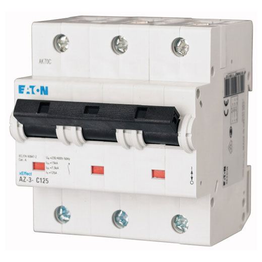 AZ-3-C100 xEfect Interruptor automático termomagnético (disyuntor MCB). 3 polo(s). Corriente nominal: 100A. Curva de disparo: tipo C. Capacidad interruptiva de acuerdo a IEC 60947-2: 20kA. Tensión nominal (IEC): 230/400VCA y 60VCD por polo. Montaje en riel DIN IEC/EN60715. Grado de protección: IP20.