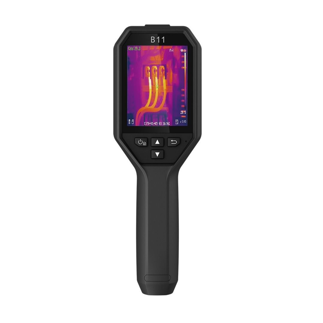 B11 Cámara termográfica compacta y fácil de usar para uso diario. Cuenta con cámara visual de 2Mpx. Display con Resolución 240 × 320, pantalla LCD de 3,2”. Comunicaciones: Wifi, e interfaz USB tipo C. IR Resolución:240x320pxcon capacidad de mejora con SuperIR. Rango de medición de temperatura: -20~550 °C. Longitud focal: 3.6mm. Rango de temperatura de trabajo: -10°C a 50°C. Sensibilidad térmica NETD: < 40 mK. Frecuencia de imagen: 25Hz.