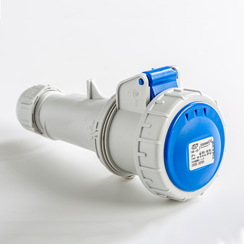 Base aérea. Corriente nominal: 16A a una tensión de trabajo de 230VCA. Configuración de contactos: 2P+T. Código horario: 6h, color azul. Resistencia impacto: IK08. Material: poliamida 6 HF, cumple la directiva RoHS. Material contacto: latón. Grado de proteccón: IP66-IP67.