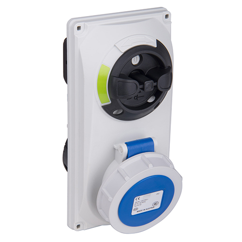 Base emportrar enclavamiento. Corriente nominal: 16A a una tensión de trabajo de 230VCA. Configuración de contactos: 2P+T. Código horario: 6h, color azul. Resistencia impacto: IK08. Material: poliamida 6 HF, cumple la directiva RoHS. Material contacto: latón. Grado de proteccón: IP66-IP67.