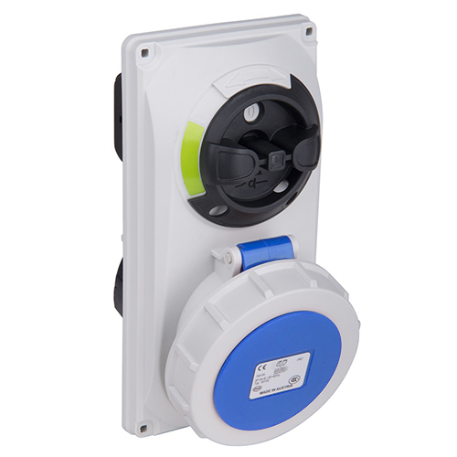 Base emportrar enclavamiento. Corriente nominal: 32A a una tensión de trabajo de 230VCA. Configuración de contactos: 2P+T. Código horario: 6h, color azul. Resistencia impacto: IK08. Material: poliamida 6 HF, cumple la directiva RoHS. Material contacto: latón. Grado de proteccón: IP66-IP67.