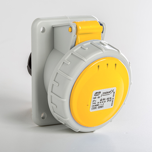 Base empotrar inclinada. Corriente nominal: 16A a una tensión de trabajo de 120VCA. Configuración de contactos: 2P+T. Código horario: 4h, color amarillo. Resistencia impacto: IK08. Material: poliamida 6 HF, cumple la directiva RoHS. Material contacto: latón. Grado de proteccón: IP66-IP67.