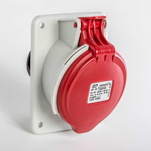 Base empotrar inclinada. Corriente nominal: 16A a una tensión de trabajo de 220/400VCA. Configuración de contactos: 3P+N+T. Código horario: 6h, color rojo. Resistencia impacto: IK08. Material: poliamida 6 HF, cumple la directiva RoHS. Material contacto: latón. Grado de proteccón: IP44.