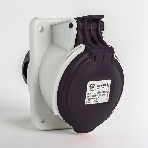 Base empotrar inclinada. Corriente nominal: 16A a una tensión de trabajo de 500VCA. Configuración de contactos: 3P+T. Código horario: 7h, color negro. Resistencia impacto: IK08. Material: poliamida 6 HF, cumple la directiva RoHS. Material contacto: latón. Grado de proteccón: IP44.