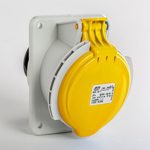 Base empotrar inclinada. Corriente nominal: 32A a una tensión de trabajo de 120VCA. Configuración de contactos: 2P+T. Código horario: 4h, color amarillo. Resistencia impacto: IK08. Material: poliamida 6 HF, cumple la directiva RoHS. Material contacto: latón. Grado de proteccón: IP44.