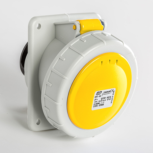 Base empotrar inclinada. Corriente nominal: 32A a una tensión de trabajo de 120VCA. Configuración de contactos: 2P+T. Código horario: 4h, color amarillo. Resistencia impacto: IK08. Material: poliamida 6 HF, cumple la directiva RoHS. Material contacto: latón. Grado de proteccón: IP66-IP67.