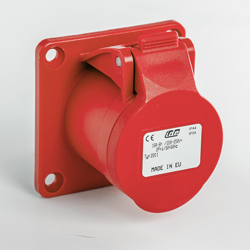 Base empotrar recta. Corriente nominal: 16A a una tensión de trabajo de 400VCA. Configuración de contactos: 2P+T. Código horario: 9h, color rojo. Resistencia impacto: IK08. Material: poliamida 6 HF, cumple la directiva RoHS. Material contacto: latón. Grado de proteccón: IP44.