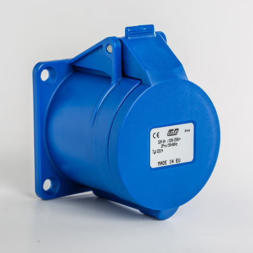 Base empotrar recta. Corriente nominal: 32A a una tensión de trabajo de 230VCA. Configuración de contactos: 2P+T. Código horario: 6h, color azul. Resistencia impacto: IK08. Material: poliamida 6 HF, cumple la directiva RoHS. Material contacto: latón. Grado de proteccón: IP44.