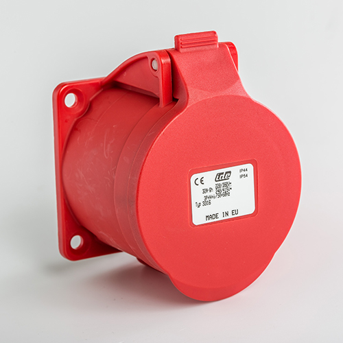 Base empotrar recta. Corriente nominal: 32A a una tensión de trabajo de 220/400VCA. Configuración de contactos: 3P+N+T. Código horario: 6h, color rojo. Resistencia impacto: IK08. Material: poliamida 6 HF, cumple la directiva RoHS. Material contacto: latón. Grado de proteccón: IP44.