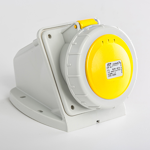 Base mural. Corriente nominal: 32A a una tensión de trabajo de 120VCA. Configuración de contactos: 2P+T. Código horario: 4h, color amarillo. Resistencia impacto: IK08. Material: poliamida 6 HF, cumple la directiva RoHS. Material contacto: latón. Grado de proteccón: IP66-IP67.