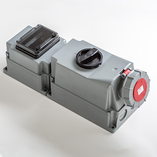 Base mural enclavamiento rail DIN. Corriente nominal: 63A a una tensión de trabajo de 220/400VCA. Configuración de contactos: 3P+N+T. Código horario: 6h, color rojo. Resistencia impacto: IK08. Material: poliamida 6 HF, cumple la directiva RoHS. Material contacto: latón. Grado de proteccón: IP66-IP67.