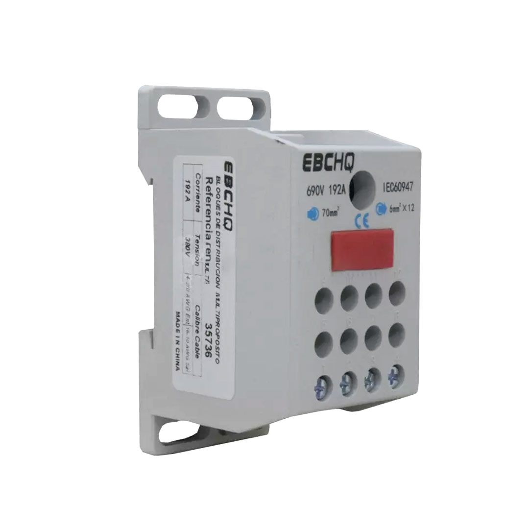 Bloque de distribución de potencia de un polo. Conexión con tecnología tornillo. Configuración de conexión de entrada: 25-70mm². Configuración de conexión de carga: 12x6mm². Color gris. Corriente nominal: 192A a una tensión máxima de 690VCA. Montaje en riel DIN: TS35/platina. Temperatura de trabajo: -50 ~ +130.