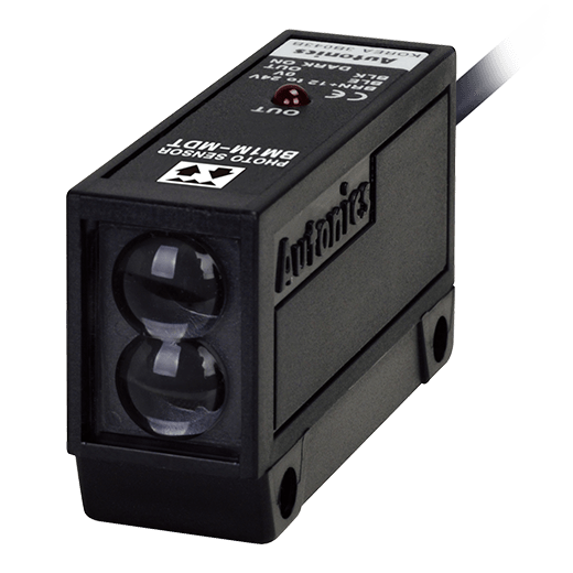 BM1M-MDT Sensor fotoeléctrico de proposito general deteccion frontal, con detección tipo retro reflectivo a una distancia máxima de operación de 1m. Sin ajuste de sensibilidad. Indicado para detectar material opaco de min. Ø60mm. Rango de tensión de alimentación: 12-24VCD. Modo de operación: Dark on. Salida de control tipo NPN colector abierto. Fuente de luz: LED infrarrojo (940 nm). Tipo de conexión: cable 2m. Protección: .