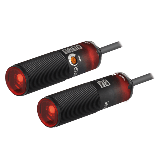 BRQP5M-TDTA Sensor fotoeléctrico cilíndrico de plástico M18, con detección tipo barrera a una distancia máxima de operación de 5m. Con ajuste de sensibilidad. Indicado para detectar material opaco de min. Ø7mm. Rango de tensión de alimentación: 12-30VCD. Modo de operación: Light ON/Dark ON (establecido por cable de control). Salida de control tipo NPN colector abierto. Fuente de luz: LED rojo (660 nm). Tipo de conexión: cable 2m. Protección: IP67.