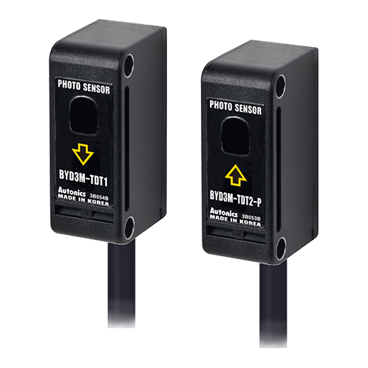 BYD3M-TDT-P Sensor fotoeléctrico compacto con amplificador integrado, con detección tipo barrera a una distancia máxima de operación de 3m. Sin ajuste de sensibilidad. Indicado para detectar material opaco de min. Ø6mm. Rango de tensión de alimentación: 12-24VCD. Modo de operación: Dark ON. Salida de control tipo PNP colector abierto. Fuente de luz: LED infrarrojo. Tipo de conexión: cable 2m. Protección: IP64.