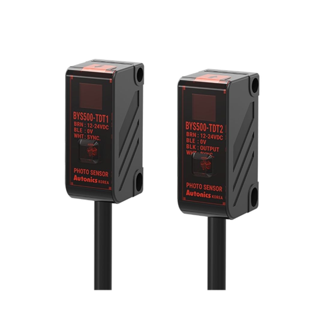 BYS500-TDT1,2 Sensor fotoeléctrico compacto con amplificador integrado, con detección lateral tipo barrera a una distancia máxima de operación de 500mm. Sin ajuste de sensibilidad. Indicado para detectar material opaco de min. Ø6mm. Rango de tensión de alimentación: 12-24VCD. Modo de operación: Dark ON. Salida de control tipo NPN colector abierto. Fuente de luz: LED infrarrojo. Tipo de conexión: cable 2m. Protección: IP64.
