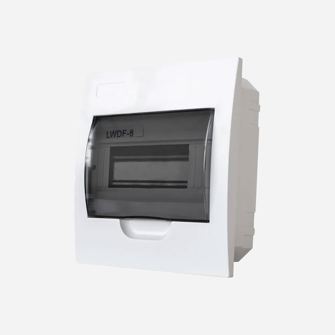 Serie LWDF. Caja de distribucion p/empotrar con 8M. Dimensiones:211mmHX199mmWX86mmD. Blanco. Material:Plastico ABS.Standard:IEC60439-3 IEC61000. Resistencia al fuego:650°C/30s. Grado de proteccion:IP40. Sugerido de producto aproximado Cod.BM8PT Marca IDE