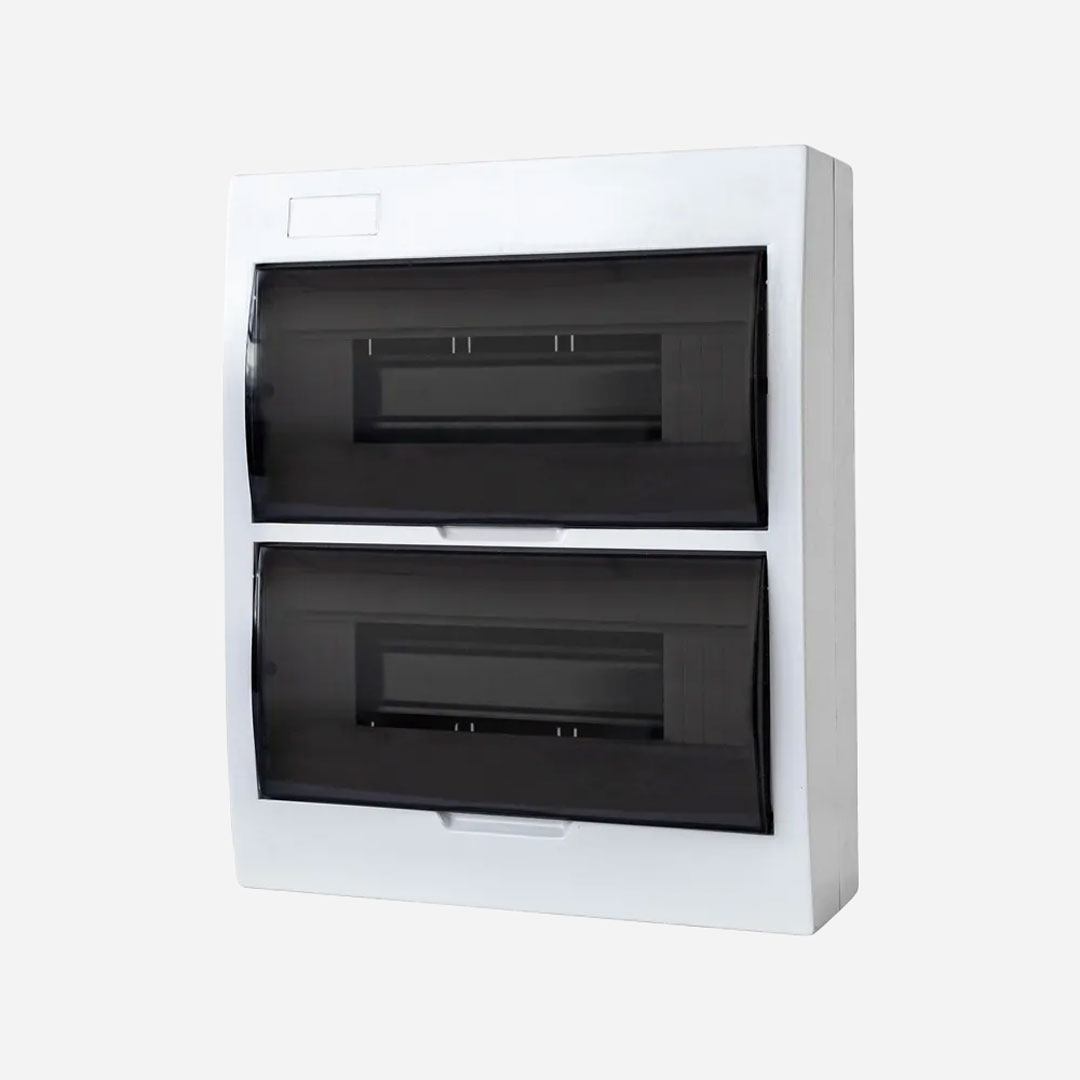 Serie LWDS. Caja de distribucion p/sobreponer con 24M. Dimensiones:326mmHX271mmWX92mmD. Blanco. Material:Plastico ABS.Standard:IEC60439-3 IEC61000. Resistencia al fuego:650°C/30s. Grado de proteccion:IP40. Sugerido de producto aproximado Cod.BV24PT Marca