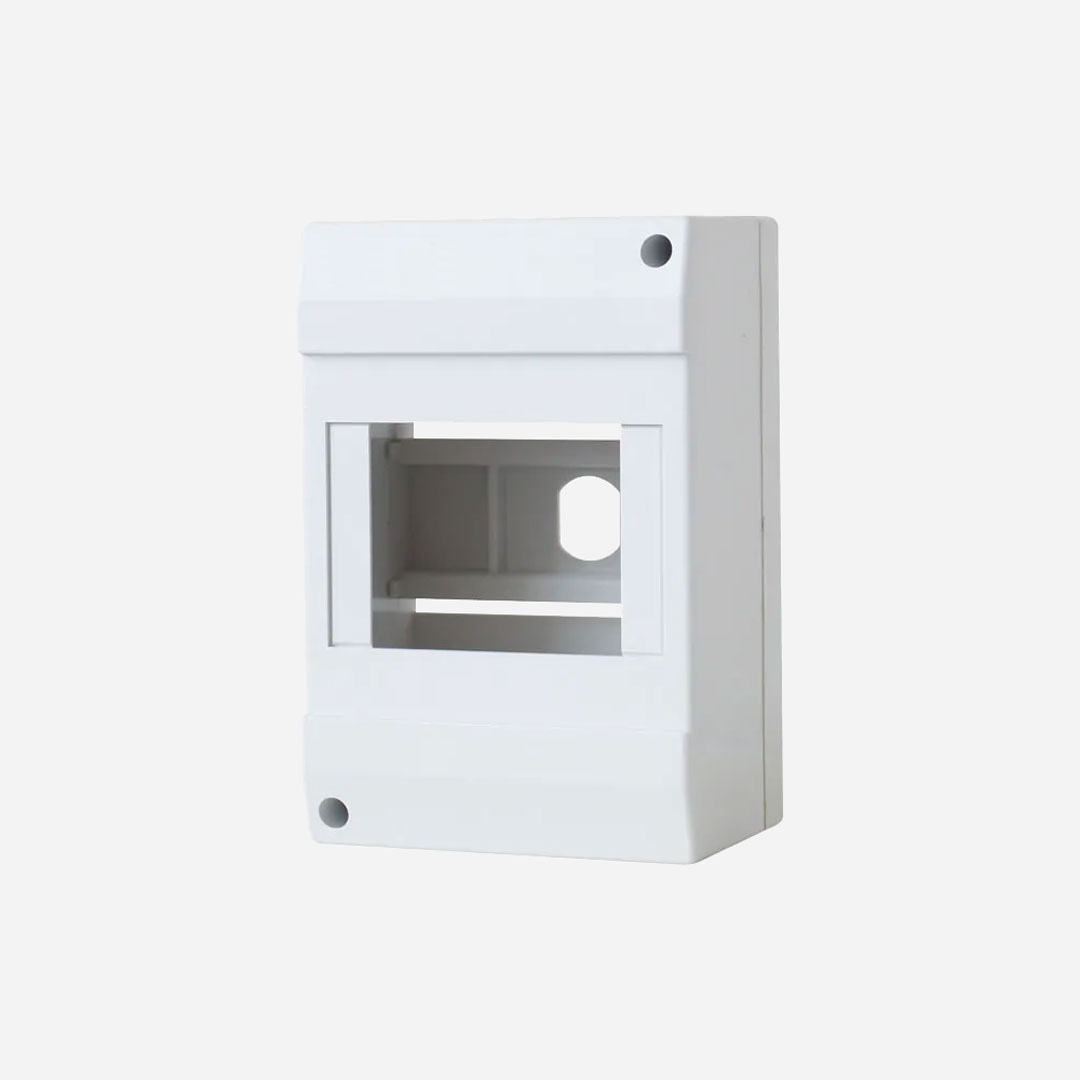 Serie LWHG. Caja de distribucion p/sobreponer con 4M. Dimensiones:130mmHX87mmWX60mmD. Blanco. Material:Plastico PS.Standard:IEC60439-3 IEC61000. Resistencia al fuego:650°C/30s. Grado de proteccion:IP30. Sugerido de producto aproximado Cod.BT4 Marca IDE