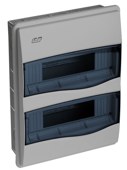 Serie . Caja de distribución para sobreponer con ventana transparente PC color fumé. Módulos: 2x12 (24) raíl DIN. Dimensiones: 436Hx310Wx148Dmm. Grado de protección: IP65. Protección impacto: IK08. Tensión de empleo: 100VAC/1500VDC. Doble aislamiento Clase II. Temperatura de trabajo: -25ºC~+40ºC. Material de base y marco: ABS Gris RAL 7035. Plásticos libres de halógenos con protección UV.
