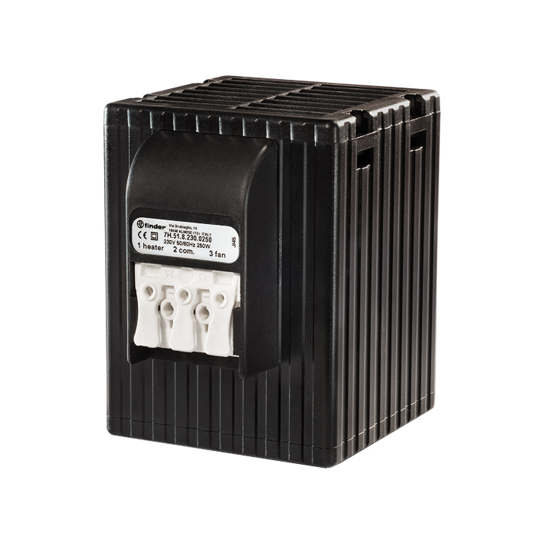 7H.51.8.230.0250 Calefactores de cuadro seguros al tacto con ventilado. Ofrece una potencia de calefacción de 250W. Está diseñado para montarse en clip para montaje en riel DIN TS 35 vertical. Se alimenta a 230VAC para su funcionamiento. Para más información, por favor consulte la ficha técnica del producto.