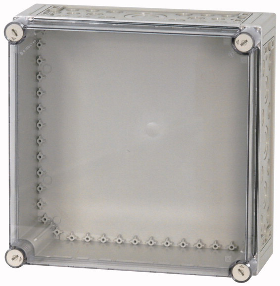 CI44E-150 Caja aislada con tapa transparente y perforaciones. Dimensiones: 375Hx375Wx175Dmm. Montaje panel. Fabricado de policarbonato reforzado con fibra de vidrio. Temperatura de operación: -40~+80. Grado de protección IP65.