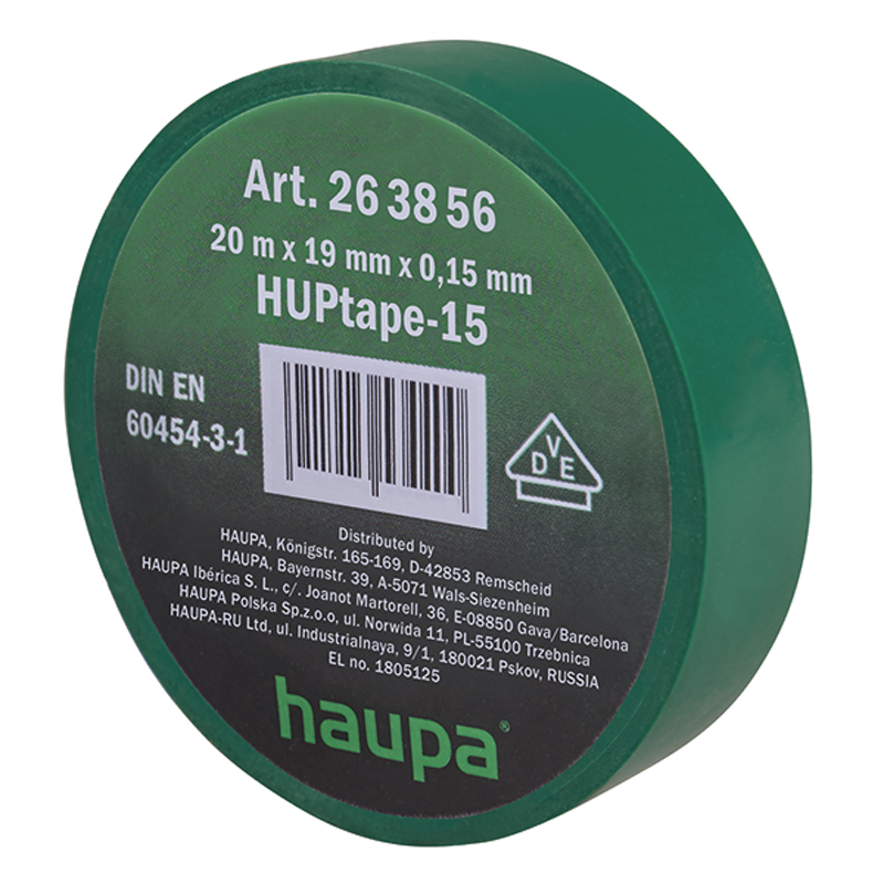 Cinta aisladora VDE 1000V 19mmx20m color verde. Temperatura de procesamiento: de -18 °C a +60 °C. Temperatura de aplicación: de -30 °C a +105 °C. Resistencia a los rayos UV: excelente, Espesor: 0,15 mm. Alargamiento en el punto de desgarro a 23 °C: 240. Fuerza de desgarro: 27 N/cm. Resistencia a la perforación: 50 kV/mm. Resistencia adhesiva: 3,5 N/cm. Inflamabilidad: autoextinguible. Material: PVC.